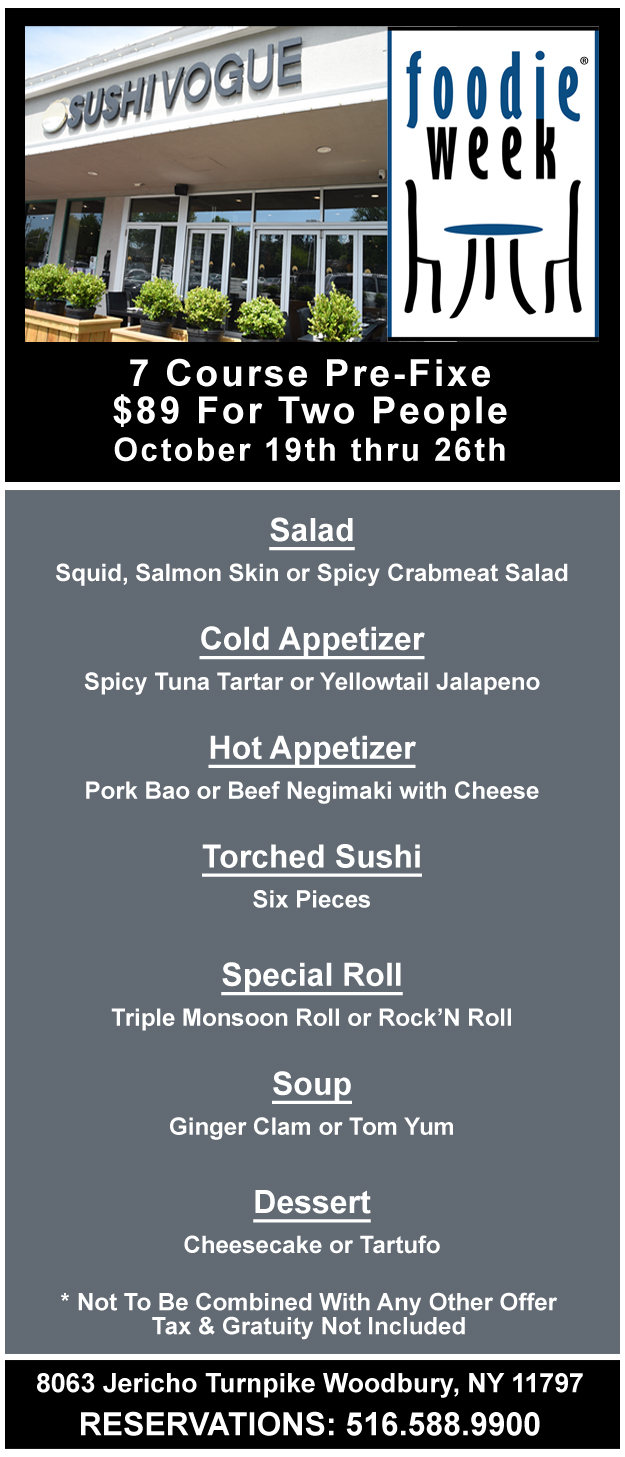 Sushi Vogue | 8063 Jericho Turnpike, Woodbury, NY 11797 | (516) 588-9900 | Special | Website |