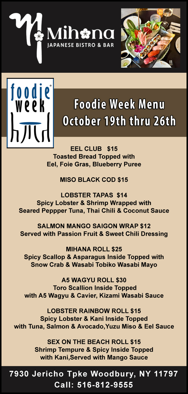 Mihana Japanese Bistro | 7930 Jericho Turnpike, Woodbury, NY 11797 | (516) 812-9555 | Specials | Website |